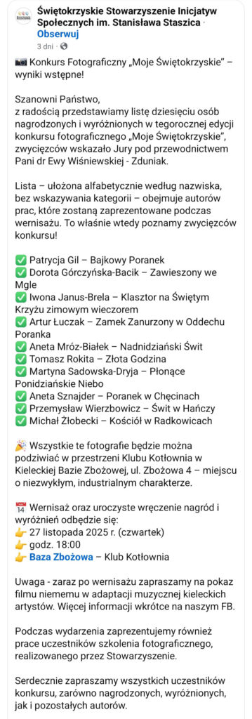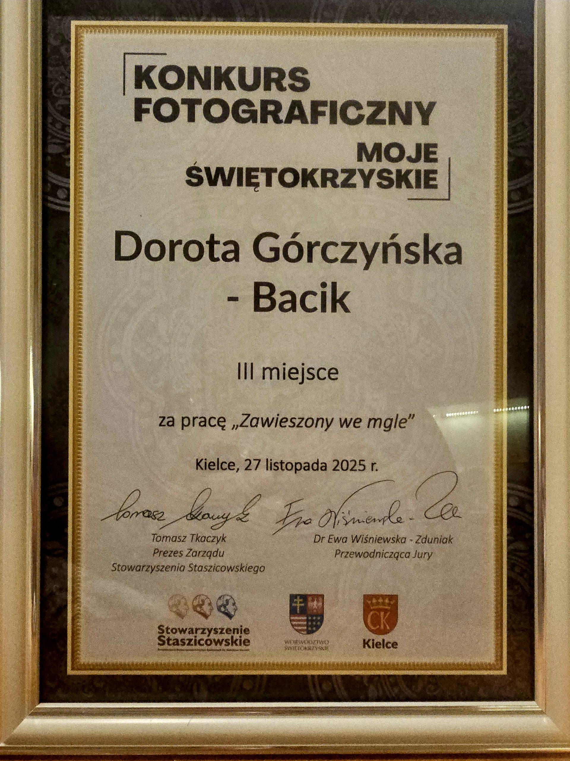 Bardzo się cieszę, że kadr który mnie kiedyś zatrzymał, park w Busku spowity we mgle, z naszym Pomnikiem „Pomnik Buskiego Kolarza” w perspektywie chmur dotykających ziemie— zatrzymał spojrzenie także i jury ![]()