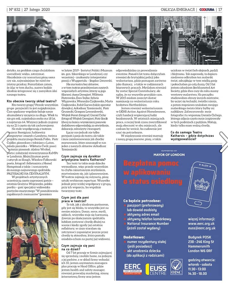 Reżyseria, scenariusz – spektakl – Kim ja jestem, Teatr Katharsis, spektakle w Dunstable, Londynie, Doncaster, Peterborough, Romford