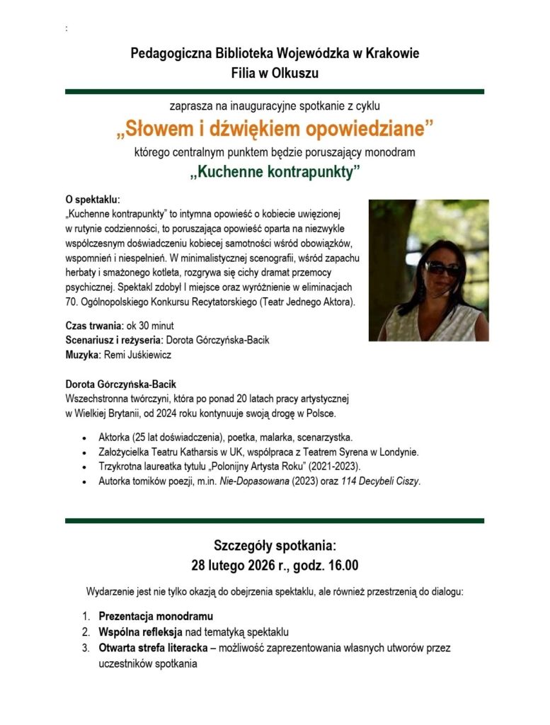 Ciesze się, że to właśnie tu mogłam prezentować moje KUCHENNE KONTRAPUNKTY monodram, oraz nasze spotkanie poetycko-muzyczne które gramy z Remi Juskiewicz od lat.